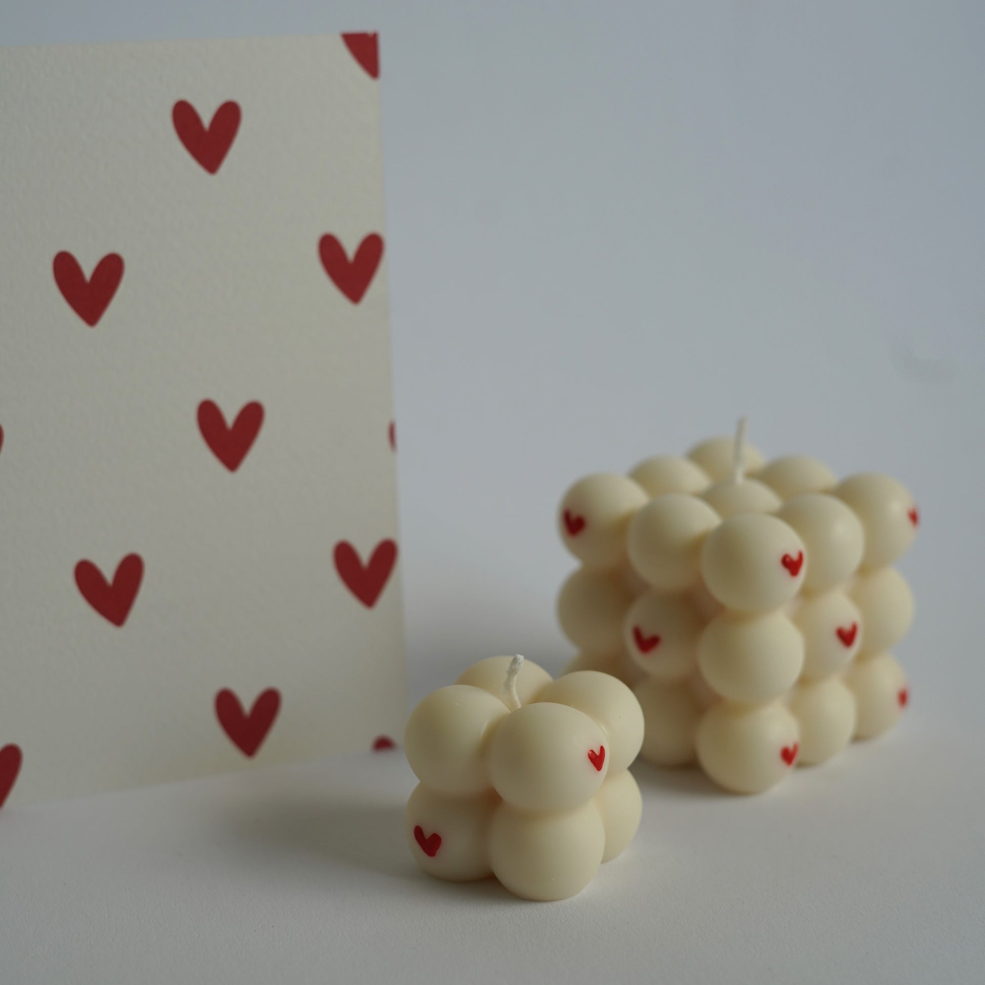 Dieses 3-teilige Set besteht aus einer Postkarte und zwei Bubble Kerzen im "Love-Stil".