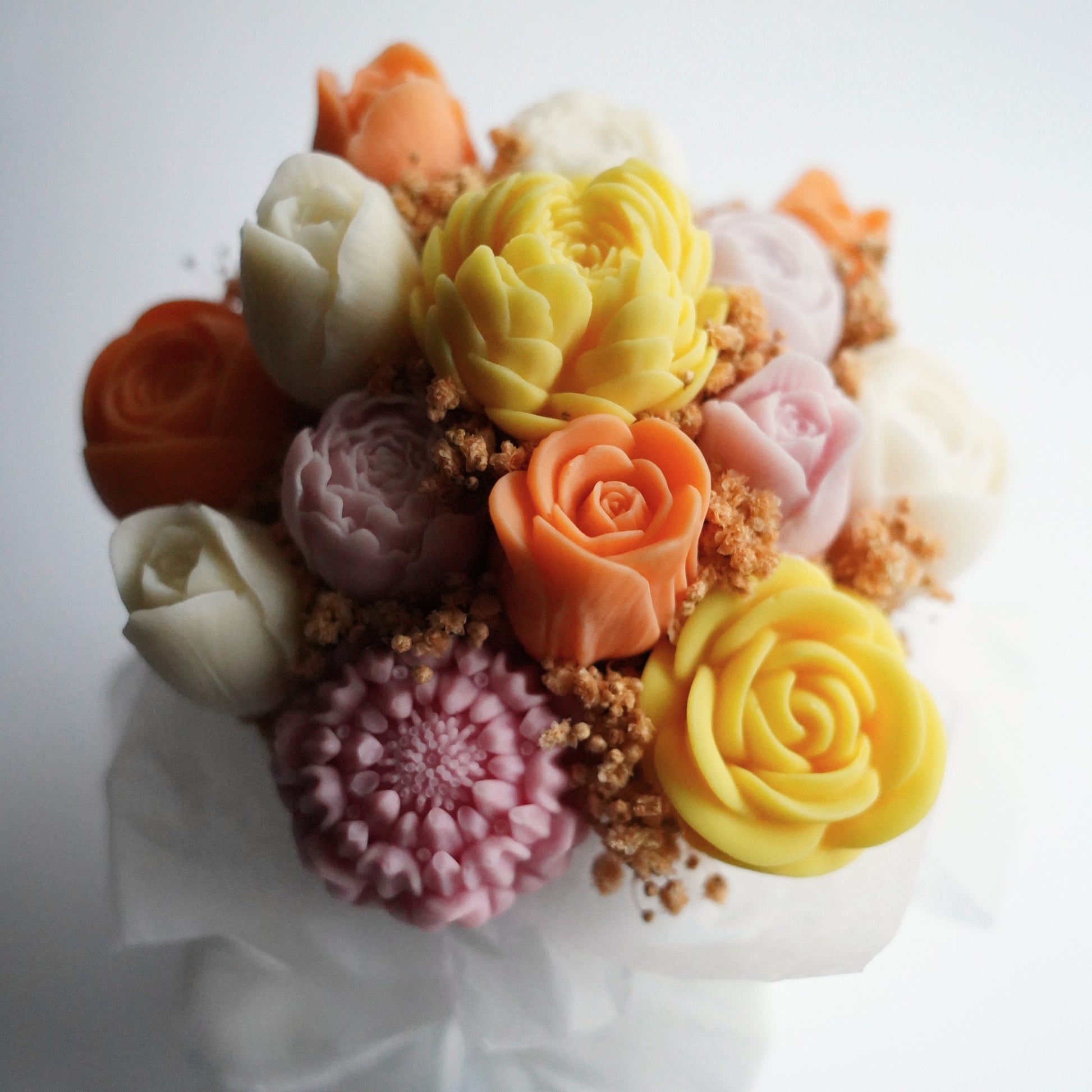 Jede Blüte entsteht in sorgfältiger Handarbeit aus hochwertigem, veganem und natürlichem Rapswachs und wird anschließend zu einem stimmigen, detailverliebten Arrangement zusammengestellt. In einer weißen Geschenkbox verpackt und mit zartem Schleierkraut verfeinert, wird der Strauß zu einem besonderen Highlight – ganz ohne jemals zu verblühen.