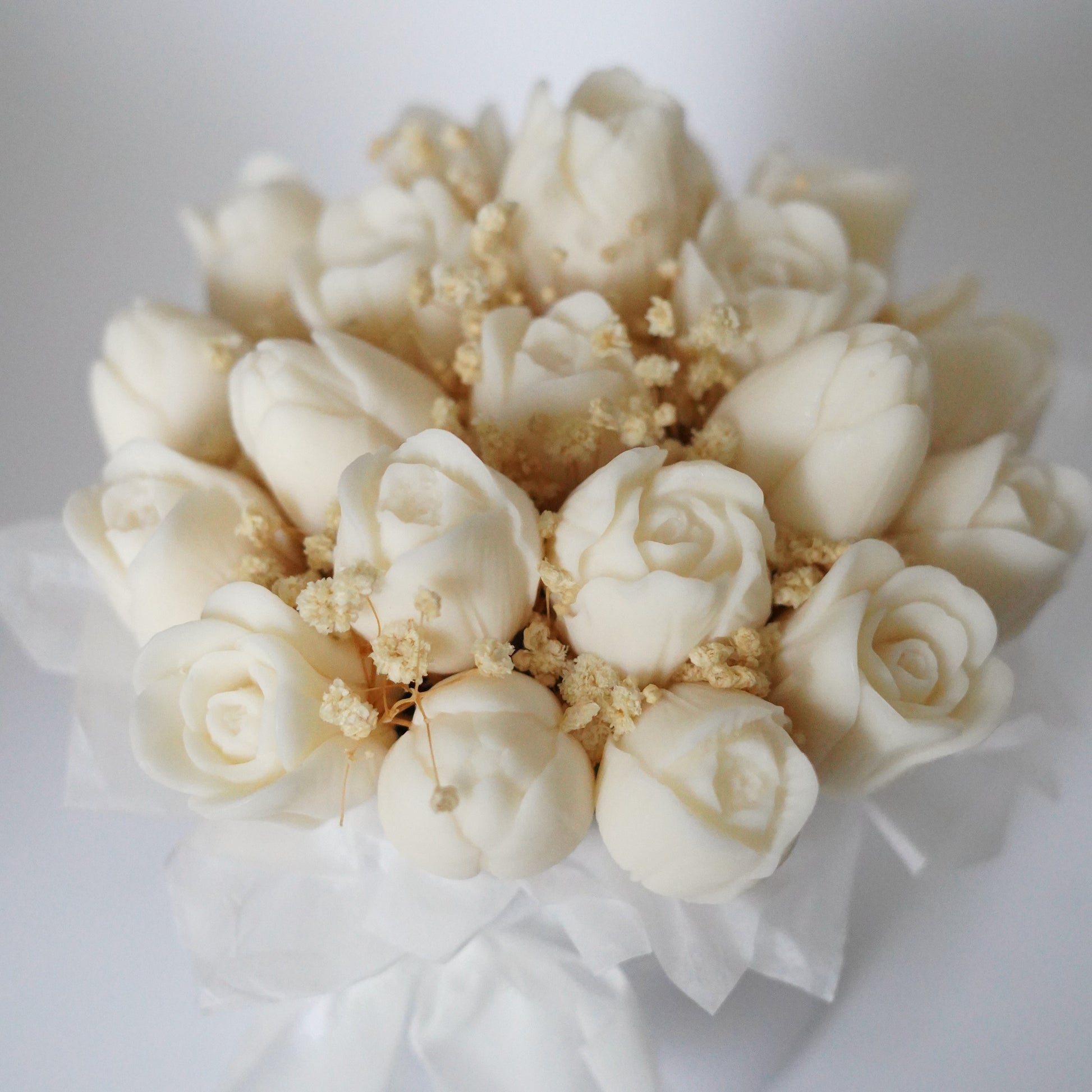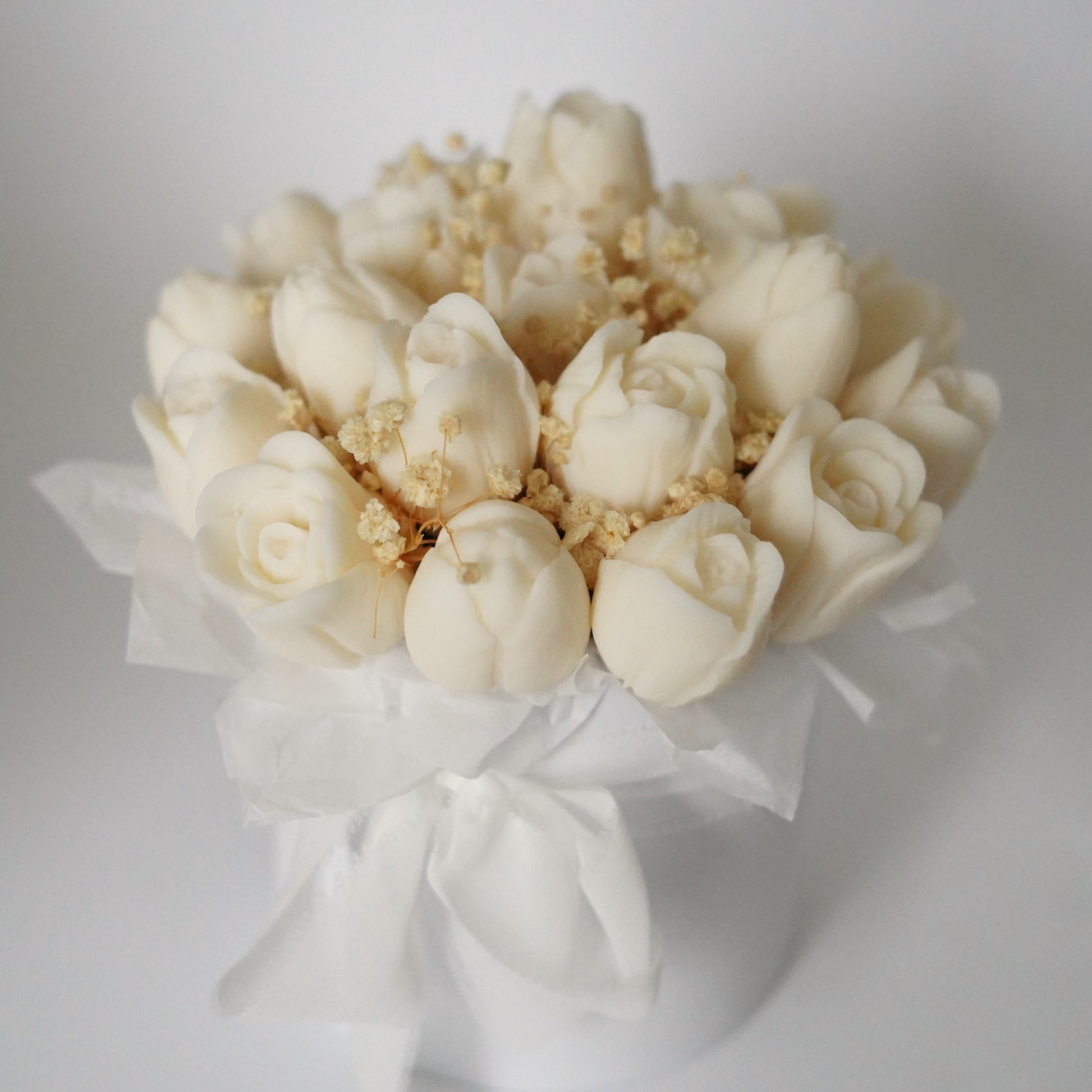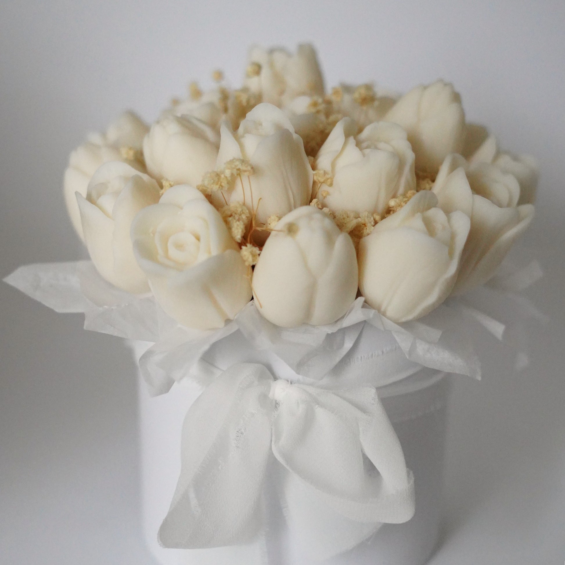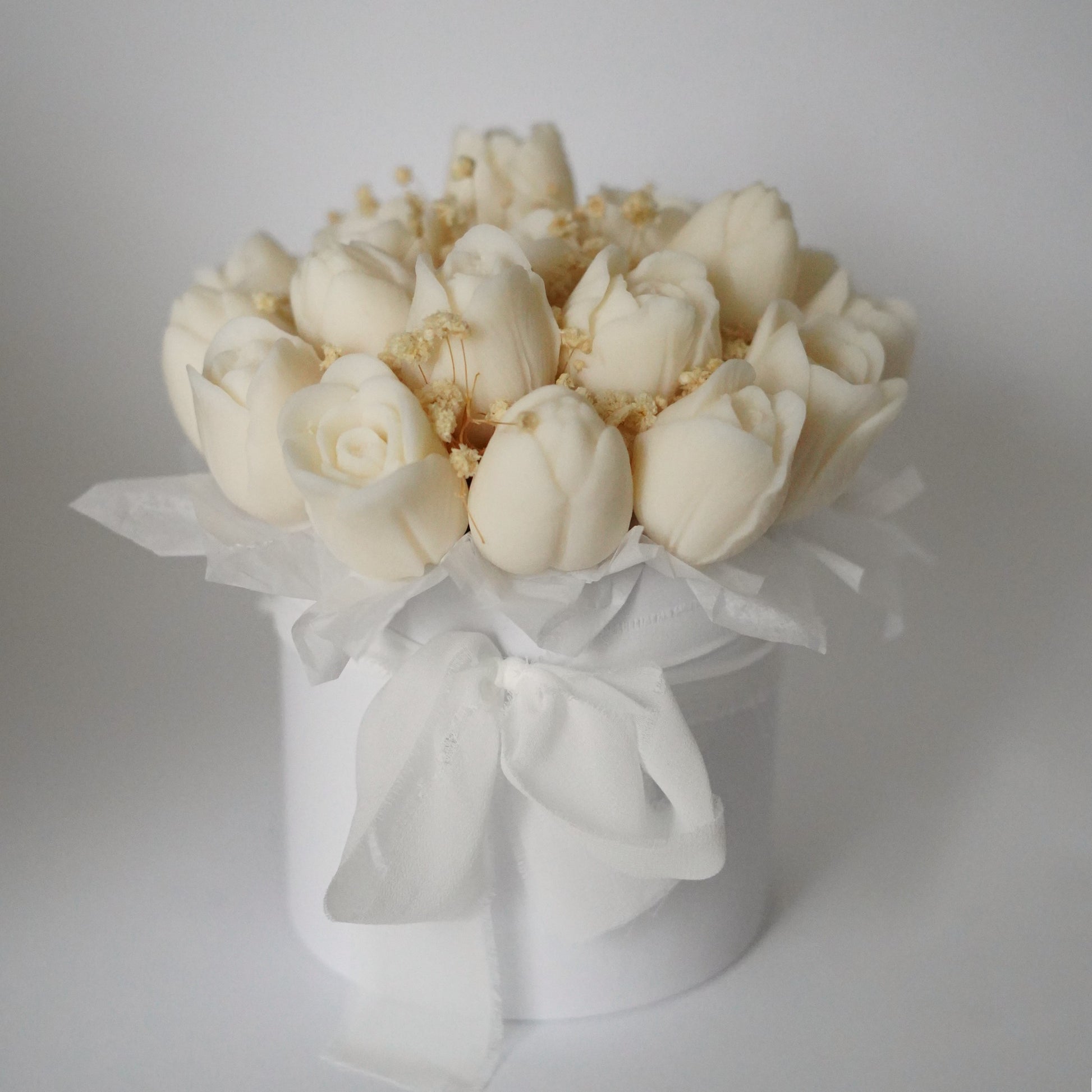 Jede Blüte entsteht in sorgfältiger Handarbeit aus hochwertigem, veganem und natürlichem Rapswachs und wird anschließend zu einem stimmigen, detailverliebten Arrangement zusammengestellt. In einer weißen Geschenkbox verpackt und mit zartem Schleierkraut verfeinert, wird der Strauß zu einem besonderen Highlight – ganz ohne jemals zu verblühen.