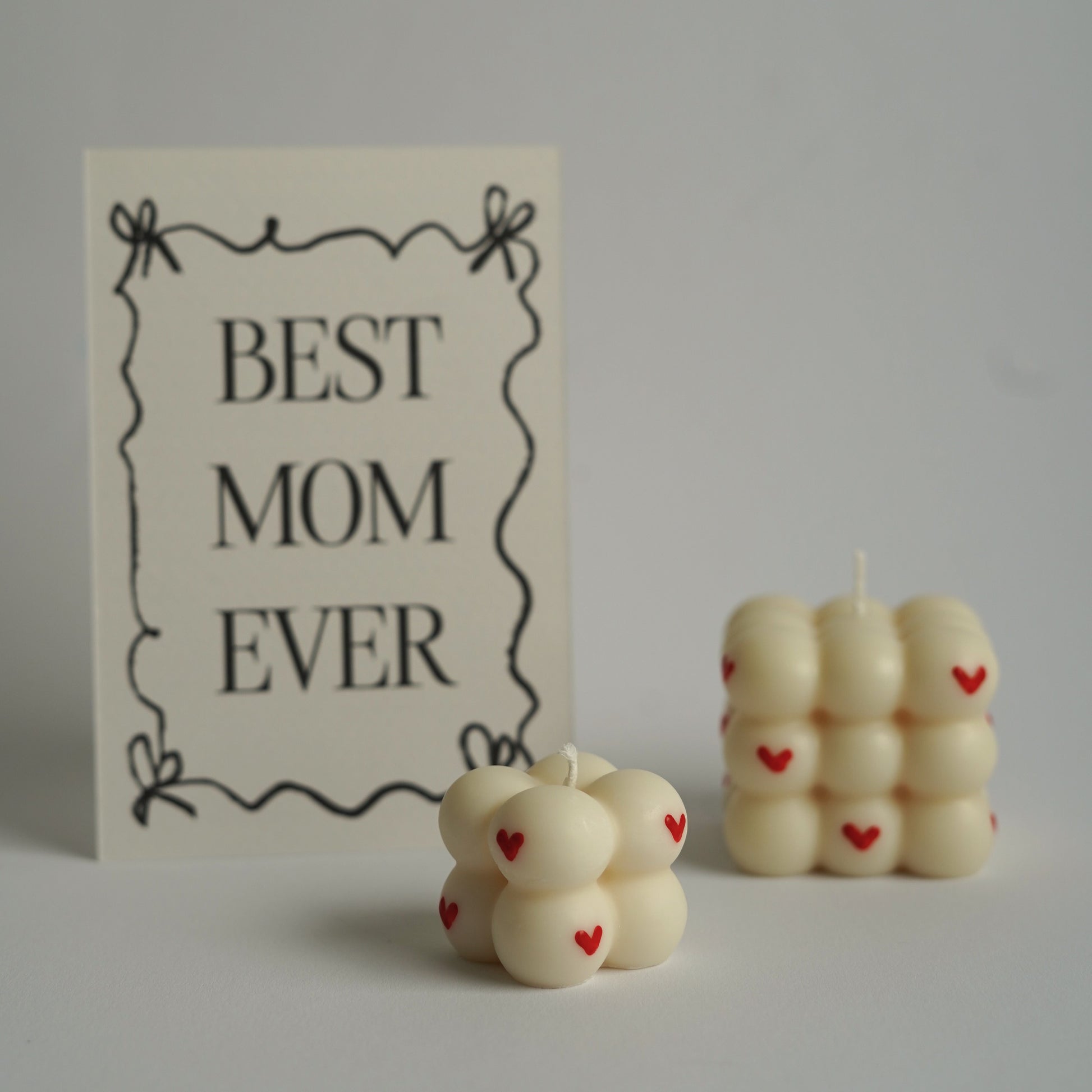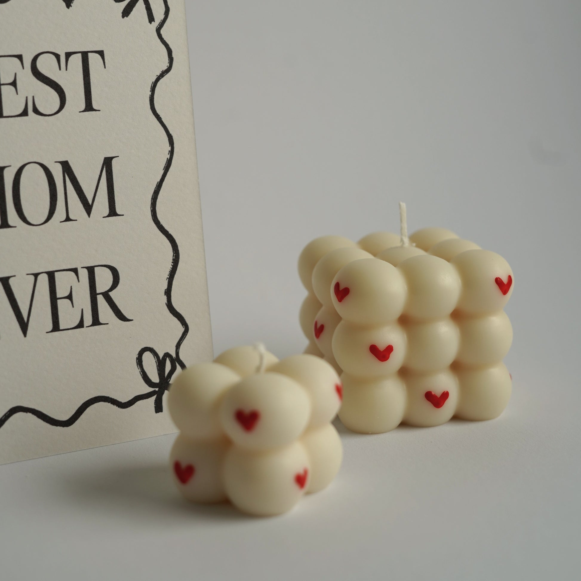 Dieses 3-teilige Set besteht aus einer Postkarte und zwei Bubble Kerzen im "Love-Stil".